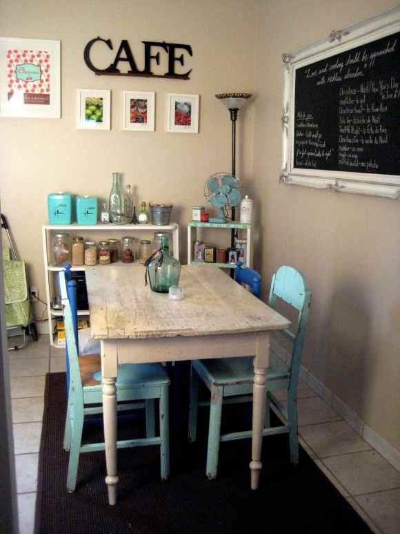 No antique market, ironic hipster boutique or junky garage sale within a 200 km radius was safe from my relentless scavenging and roving eagle eye. Much care, imagination and elbow grease went into creating some of the best pieces. I’m particularly proud of the “antique” kitchen chalkboard which I MacGyvered out of a gaudy gold-framed oil painting (surely the remains of some enterprising effort from an amateur artist in the 80s). One 2×4 piece of pressboard, a pint of blackboard paint, some sandpaper, whitewash, and lots of spit and polish later, and I had the perfect centerpiece for my “kitchen café”.